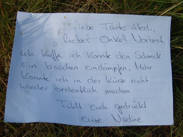 Als wir ca. eine Stunde nach dem Anruf dort ankamen, fanden wir diesen lieben Zettel dort: